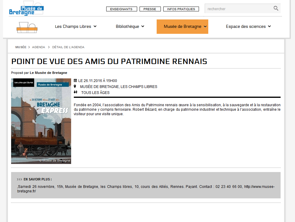 Une cinquantaine de personnes, adhérent(e)s des APR, membres de l’AMEBB, cheminots, visiteurs opportuns; étaient présentes ce samedi 26 novembre après-midi au Musée de Bretagne pour une approche de l’exposition « Bretagne Express » guidée par Robert BEZARD, administrateur des APR et ancien cheminot.